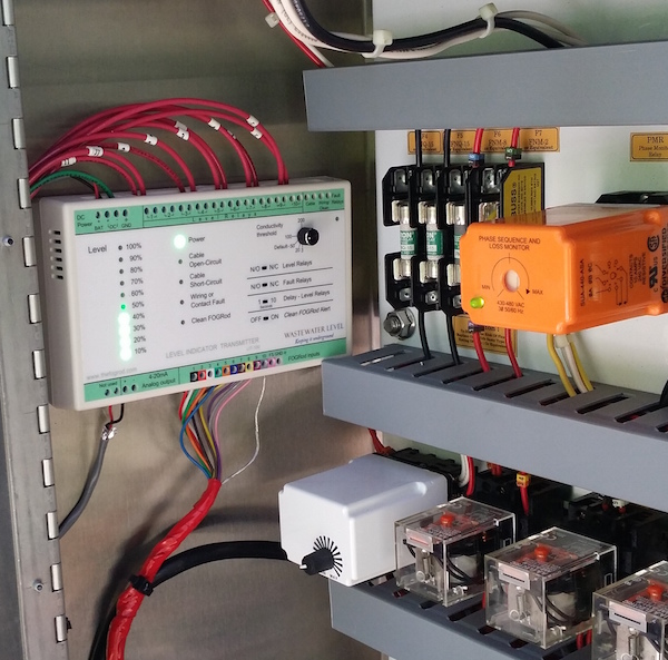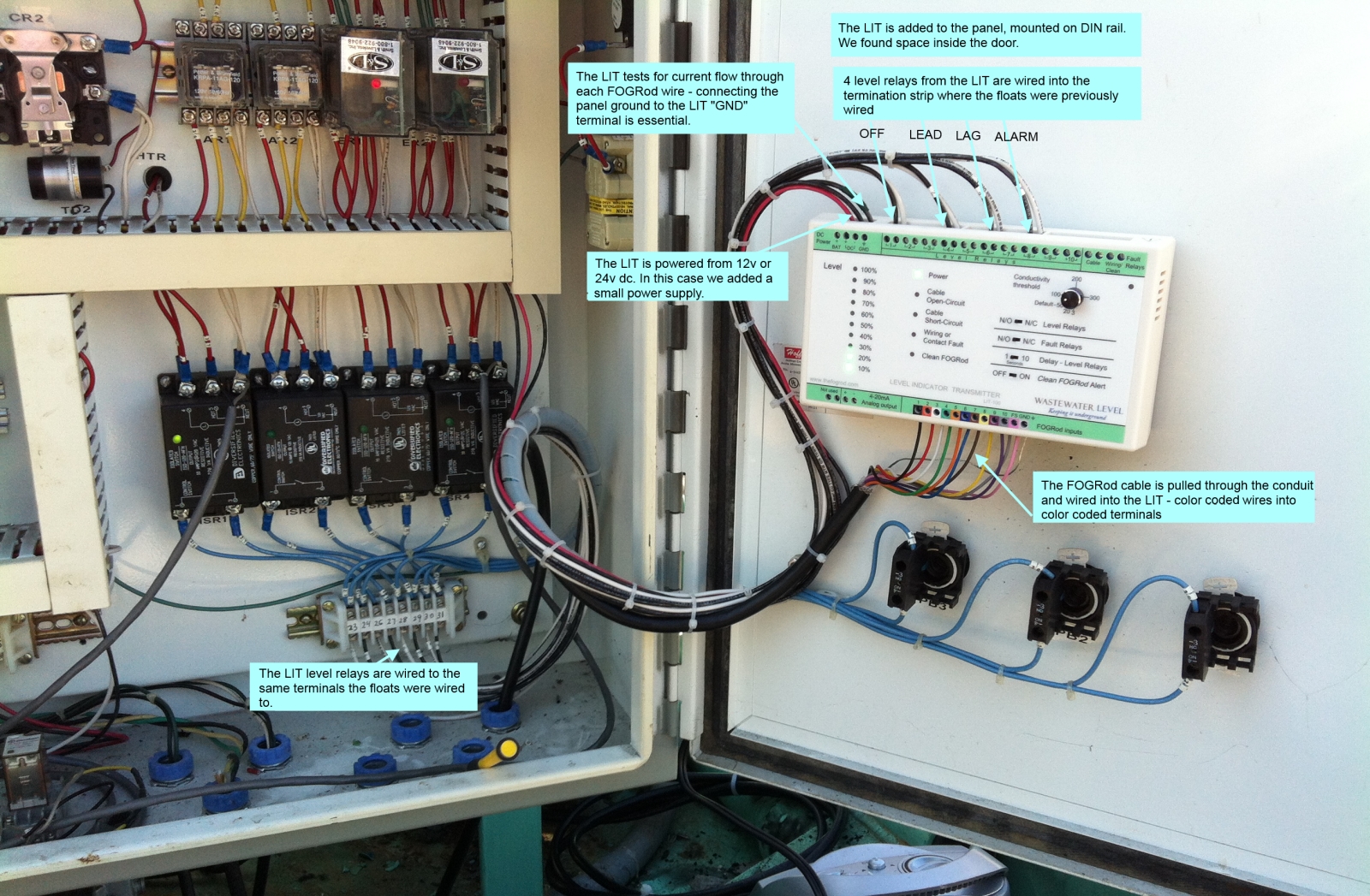 Level Indicator Transmitter – The LIT (Level Indicator Transmitter) clips onto DIN rail in the panel. The FOGRod cable is wired into the color coded terminals.