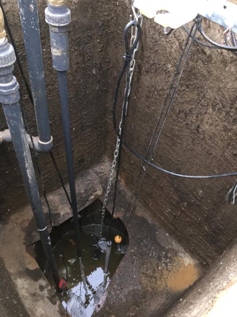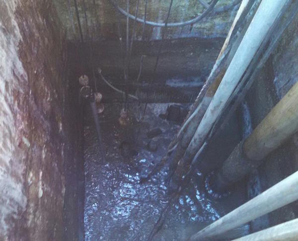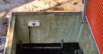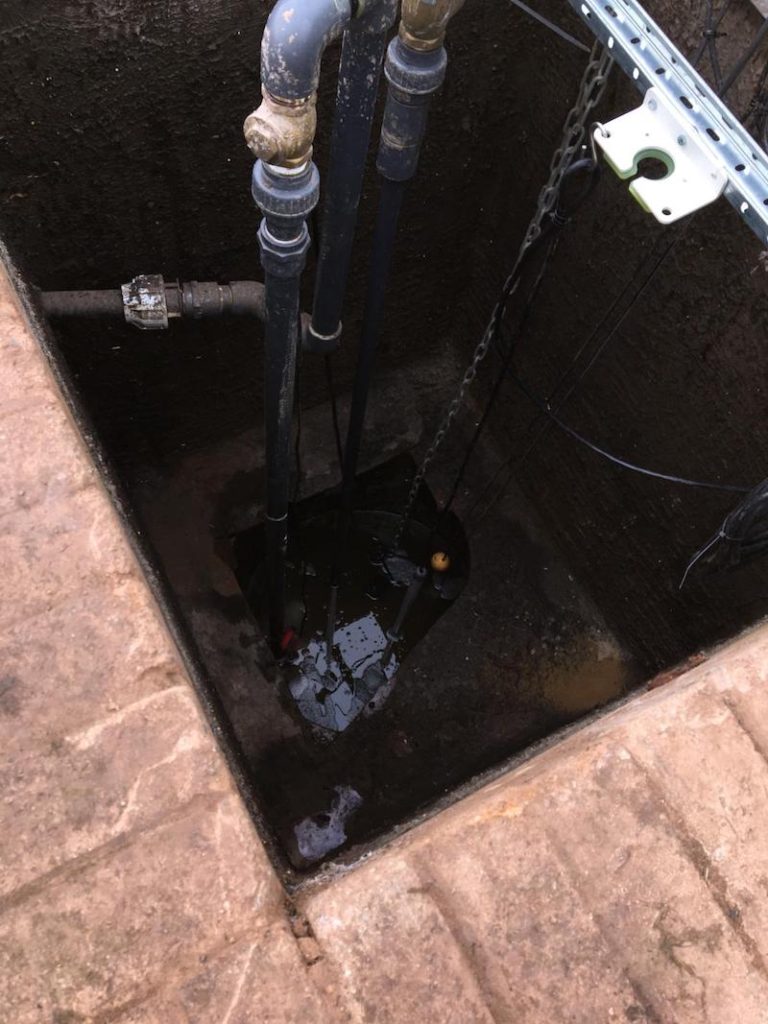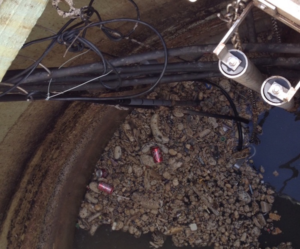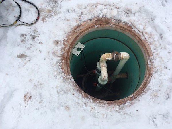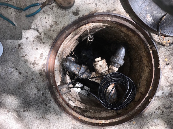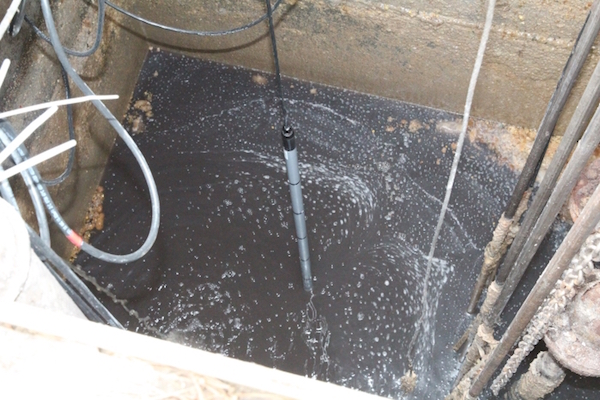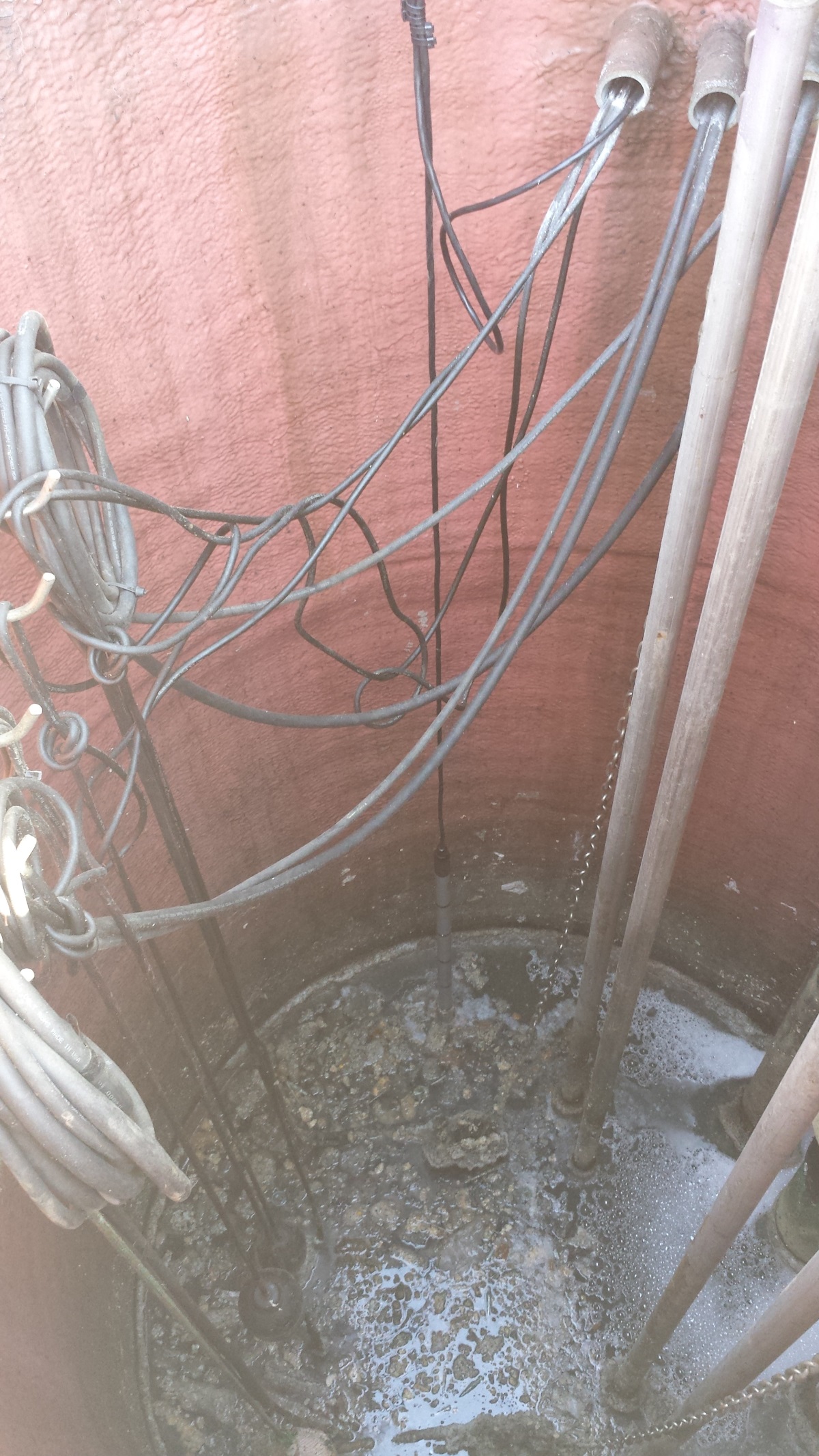 The wetwell – the Fogrod cleaning bracket is in the bottom right corner of the photo, with the Fogrod hanging under the bracket in the bottom of the wetwell. This lift station level sensor can’t easily be seen, but it is hanging in the more turbulent part of the wetwell: