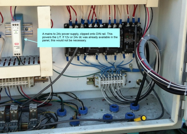 The LIT runs off 12v or 24v dc, which was not available in this panel so we added a power supply: