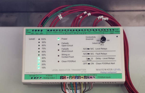 Another site in the same network with the analog output (bottom left) connected to SCADA for remote monitoring of level. Later all of the sites were converted to FOGRods and all were connected up to SCADA for remote level: