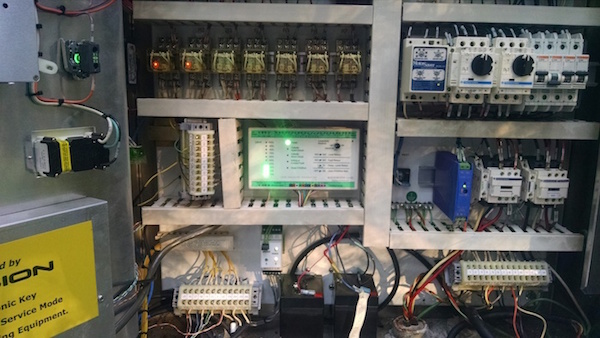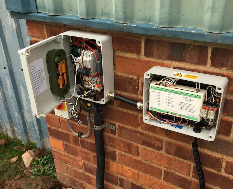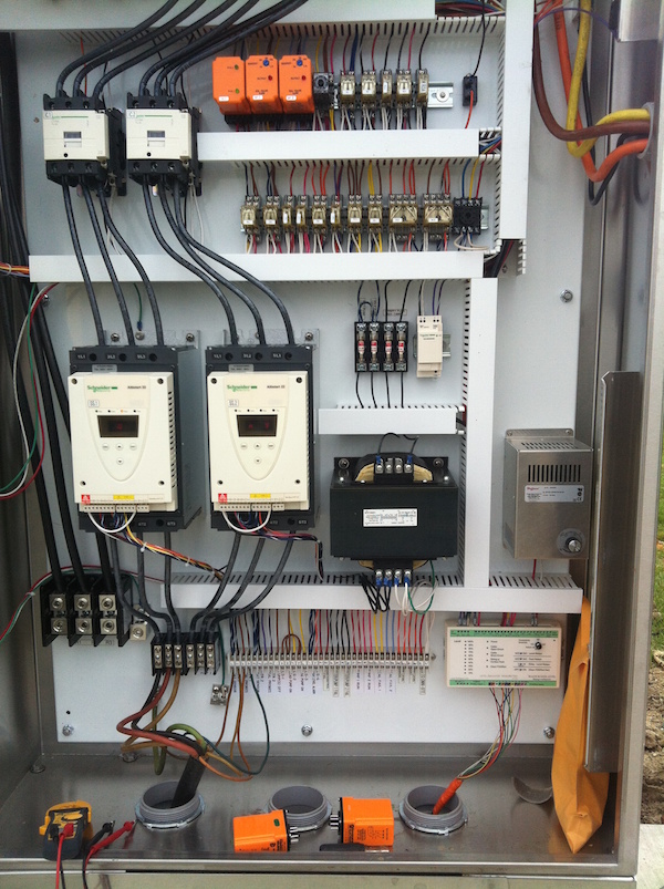 A new control panel with soft-starters. The LIT (Level Indicator Transmitter) is in the bottom right of the panel. You can see the Fogrod cable coming up through the conduit, wired into the bottom of the LIT: